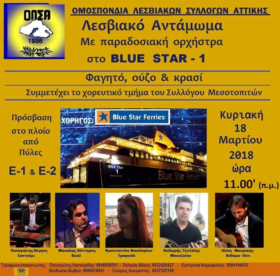 Την Κυριακή 18 Μαρτίου στις 11:00 το πρωί, θα πραγματοποιηθεί επάνω στο πολυτελές πλοίο Blue Star 1, το “Λεσβιακό Αντάμωμα” από την Ομοσπονδία Λεσβιακών Συλλόγων Αττικής.